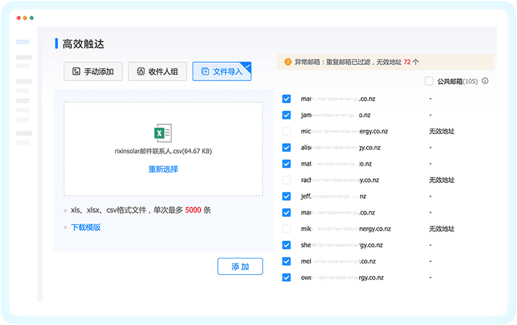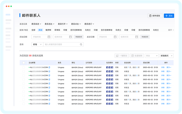 PA真人视讯外贸通内置自动发送系统,根据需求智能分析投递线路,抵达率达90%以上;联系人管理、重要度匹配、无效邮箱过滤等功能,触达、跟进更高效