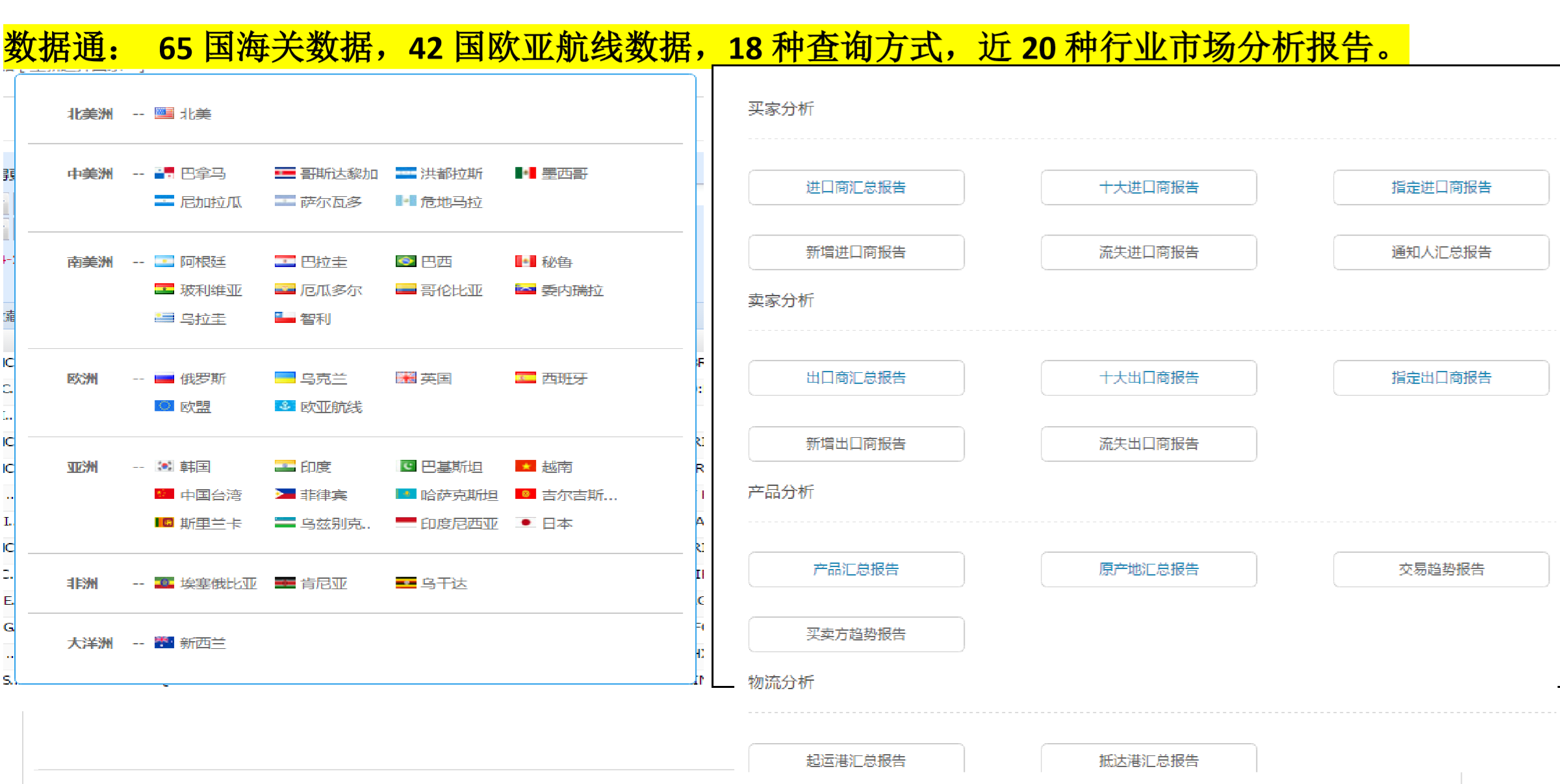 PA真人视讯海关数据库,实时给予全球涵盖65国海关数据,42国欧亚航线数据,100+亿实时贸易数据,定位1.8亿全球企业信息,帮助您分析全球市场贸易趋势及分布,为您的产品快速、精准、科学地锁定热销国家和新兴市场。